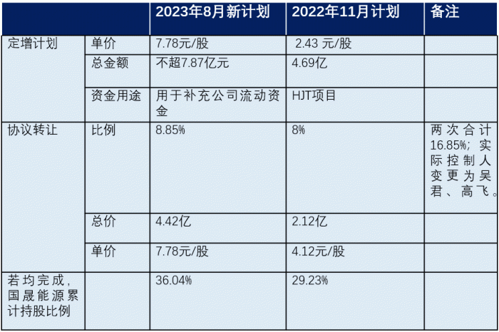 前后两个方案相同之处是,控股权还是转让给吴君、高飞控制的国晟能源;所不同的是他们二人付出的成本更高,获取公司控制权的时间节点也提前了。