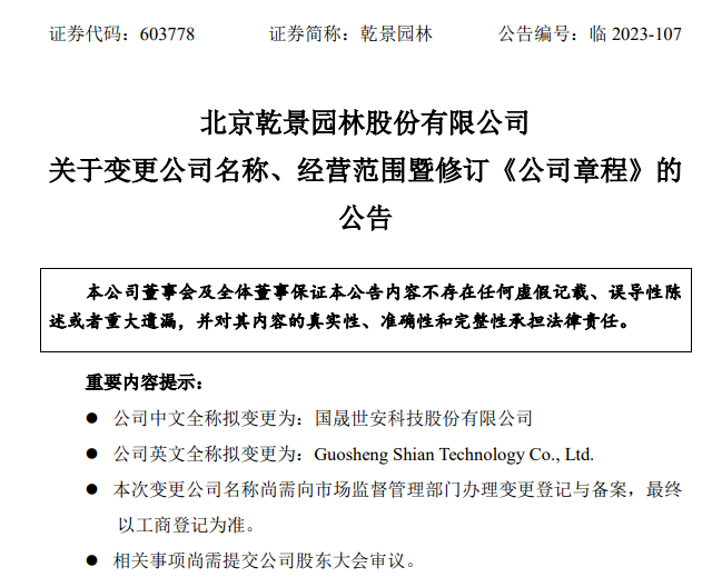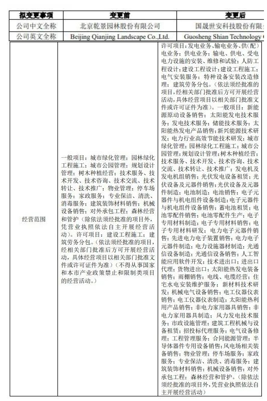 根据公告内容显示,公司中文名字由“北京乾景园林股份有限公司”变更为“国晟世安科技股份有限公司”,而公司的经营范围从原来主营的园林工程施工和园林景观设计,新增光伏制造业务、风力发电技术服务等。