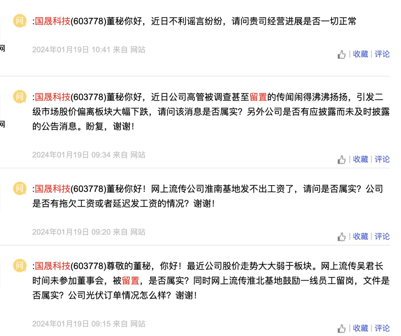 国晟科技突然自爆公司董事长被留置已经近3个月,无疑引起轩然大波。而在此之前,市场上早已有相关消息传出。钛媒体APP梳理发现,1月19日以来,有多位投资者在上证e互动上针对吴君被留置、拖欠工资等向公司求证,不过上述提问均未得到国晟科技的回复。
