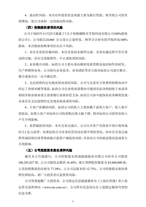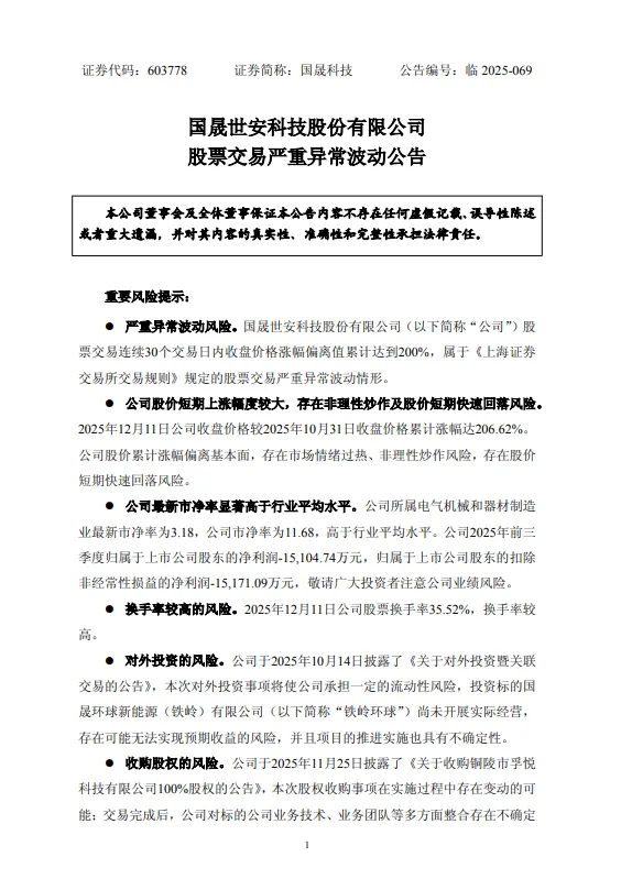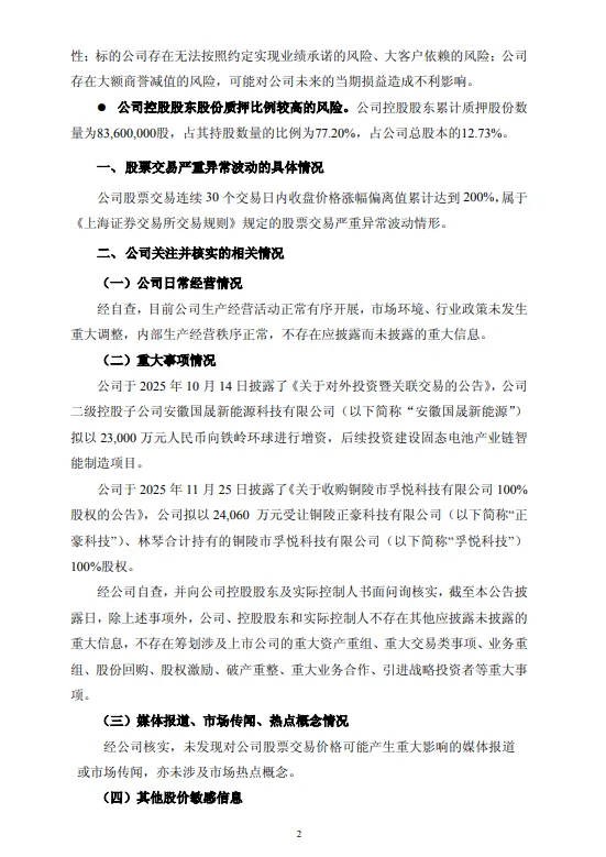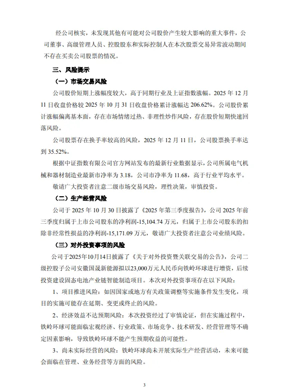 三是公司股价短期上涨幅度较大,高于同期行业及上证指数涨幅。2025年12月11日收盘价格较2025年10月31日收盘价格累计涨幅达206.62%。公司股价累计涨幅偏离基本面,存在市场情绪过热、非理性炒作风险,存在股价短期快速回落风险。
