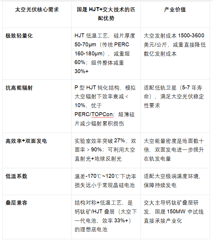 异质结(HJT)并非仅适配地面,而是目前唯一能同时满足“地面大规模量产+太空极端环境适配”的技术路线,交大科研数据与国晟产业化能力完全互补: