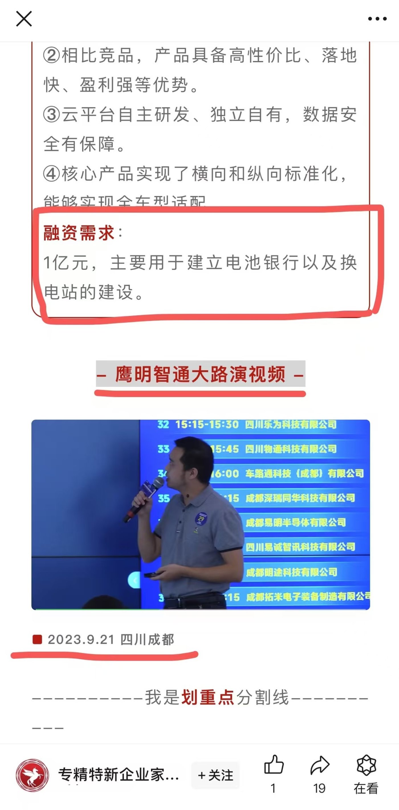 但公告显示,此次重组交易筹划过程中未出现涉及约定排他期的信息公布。此外,钛媒体APP查询公开信息发现,2023年9月21日,也就是雅运股份公布筹划重组消息后4个月,鹰明智通参加了一场面向四川专精特新企业举办的融资活动。彼时,鹰明智通的融资需求是1亿元,主要用于建立电池银行以及换电站的建设。