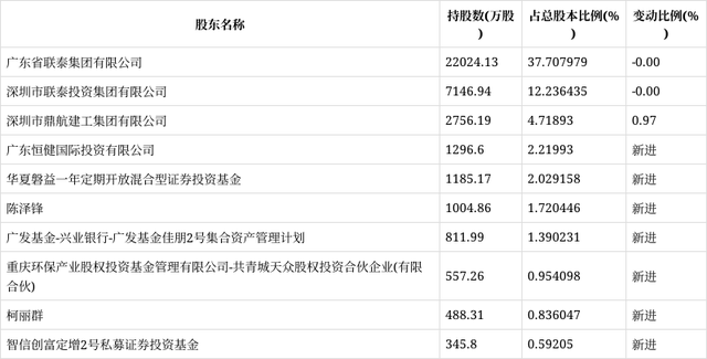 2022年一季度末的公司十大流通股东中,新进股东为广东恒健国际投资有限公司、华夏磐益一年定期开放混合型证券投资基金、陈泽锋、广发基金-兴业银行-广发基金佳朋2号集合资产管理计划、重庆环保产业股权投资基金管理有限公司-共青城天众股权投资合伙企业(有限合伙)、柯丽群、智信创富定增2号私募证券投资基金。在具体持股比例上,深圳市鼎航建工集团有限公司持股有所上升,广东省联泰集团有限公司、深圳市联泰投资集团有限公司持股有所下降。
