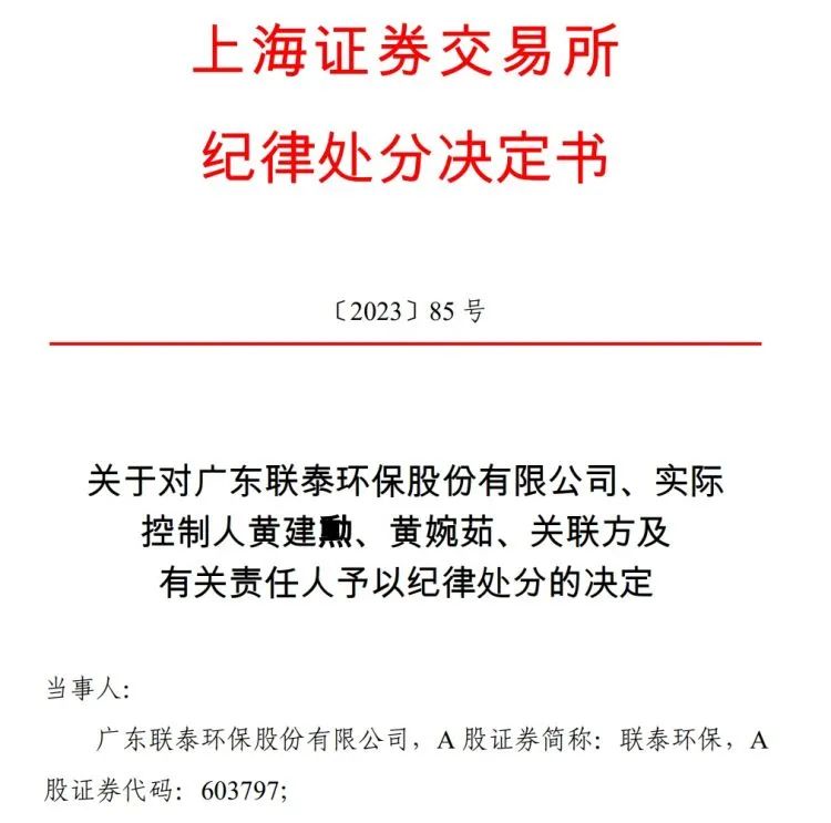 8月7日,上海证券交易所发布公告,宣布对广东联泰环保股份有限公司(简称联泰环保)、实际控制人黄建勲、黄婉茹、关联方及有关责任人予以纪律处分。