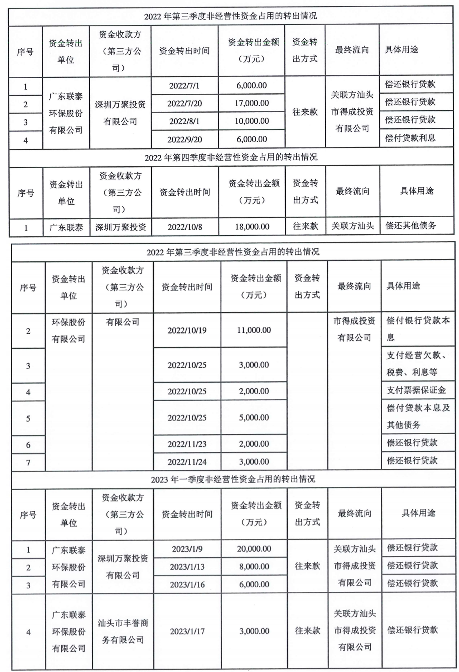 《每日经济新闻》记者注意到,联泰环保及相关主体的违规行为,主要与关联方非经营性资金占用有关,经上交所查明的累计发生金额达到12亿元,其中2022年第三季度发生3.9亿元、第四季度发生4.4亿元,2023年第一季度同样达到3.7亿元。