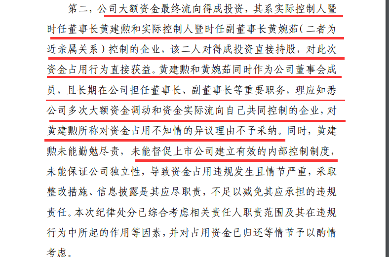同时,上交所表示,公司大额资金最终流向得成投资,其系实际控制人暨时任董事长黄建勲和实际控制人暨时任副董事长黄婉茹(二者为近亲属关系)控制的企业,该二人对得成投资直接持股,对此次资金占用行为直接获益。黄建勲和黄婉茹同时作为公司董事会成员,且长期在公司担任董事长、副董事长等重要职务,理应知悉公司多次大额资金调动和资金实际流向自己共同控制的企业,对黄建勲所称对资金占用不知情的异议理由不予采纳。