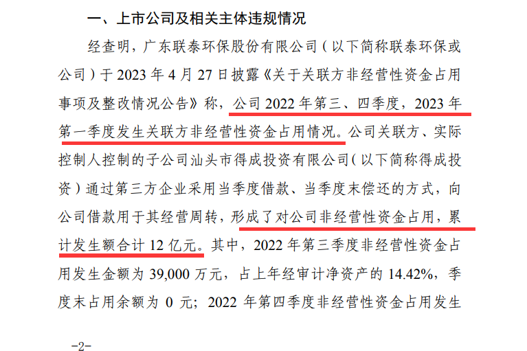 联泰环保关联方、实际控制人控制的子公司汕头市得成投资有限公司(以下简称得成投资)通过第三方企业采用当季度借款、当季度末偿还的方式,向联泰环保借款用于其经营周转,形成了对联泰环保非经营性资金占用,累计发生额合计 12 亿元。