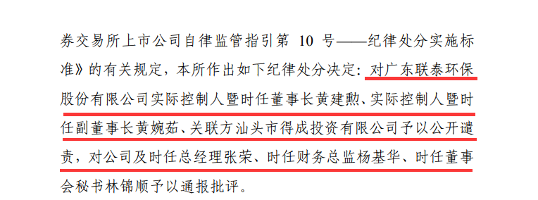 鉴于上述违规事实和情节,根据《股票上市规则》第 13.2.3条和《上海证券交易所纪律处分和监管措施实施办法》《上海证券交易所上市公司自律监管指引第 10 号——纪律处分实施标准》的有关规定,本所作出如下纪律处分决定:对广东联泰环保股份有限公司实际控制人暨时任董事长黄建勲、实际控制人暨时任副董事长黄婉茹、关联方汕头市得成投资有限公司予以公开谴责,对公司及时任总经理张荣、时任财务总监杨基华、时任董事会秘书林锦顺予以通报批评。