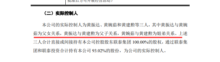 公开资料显示,联泰环保的实际控制人为黄振达及其儿子黄建勲、女儿黄婉茹三人。其中,黄建勲、黄婉茹为姐弟关系。黄振达、黄建勲、黄婉茹三人合计直接或间接持有公司控股股东联泰集团合计 100%的股份,通过联泰集团和联泰投资间接持有本公司合计56.84%的股份,为公司的实际控制人。