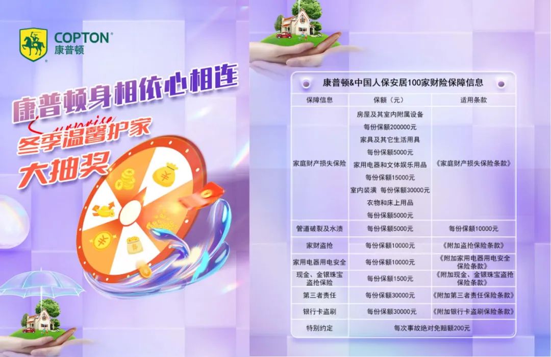 康普顿与合作伙伴身相依、心相连,风雨相伴,胜似一家人。在此特殊时刻启动“冬季温馨护家大抽奖”活动,共计抽出1000份保额可达20万元的家财险,为康普顿家人们的家庭财产送上一份保障。