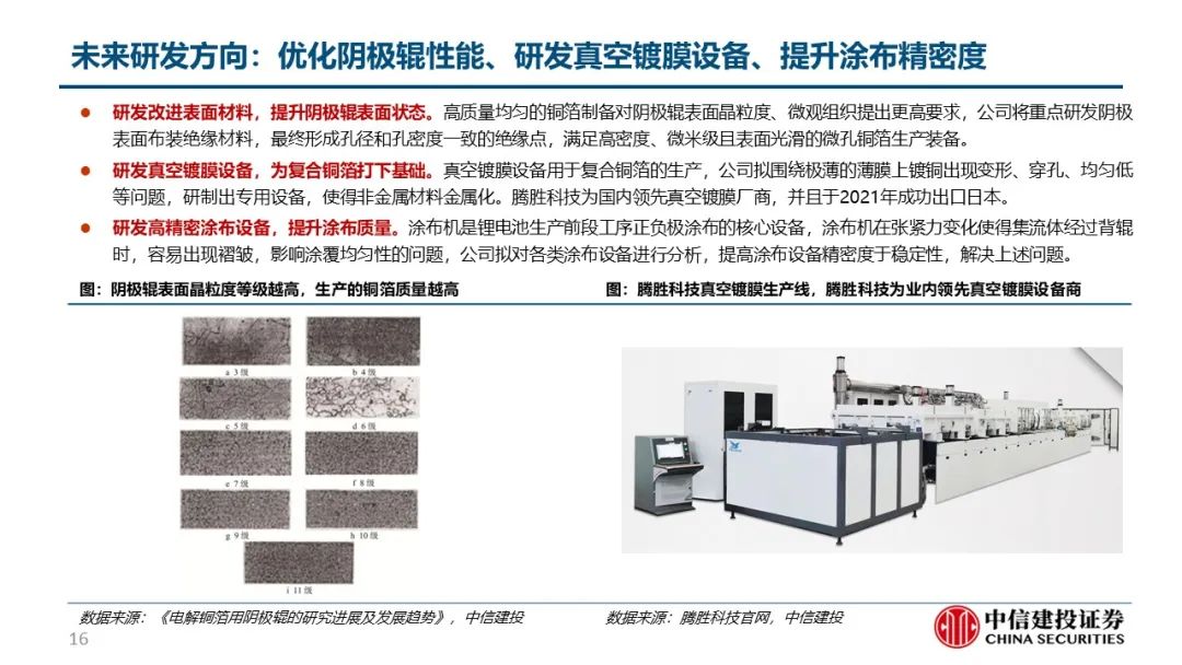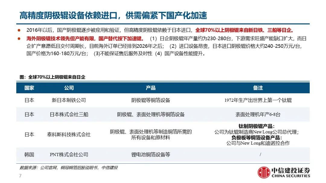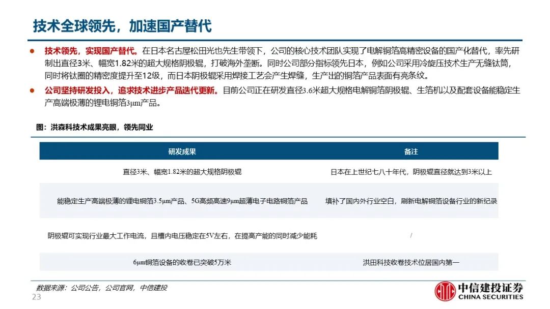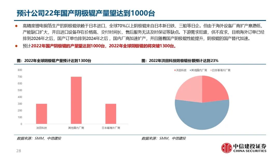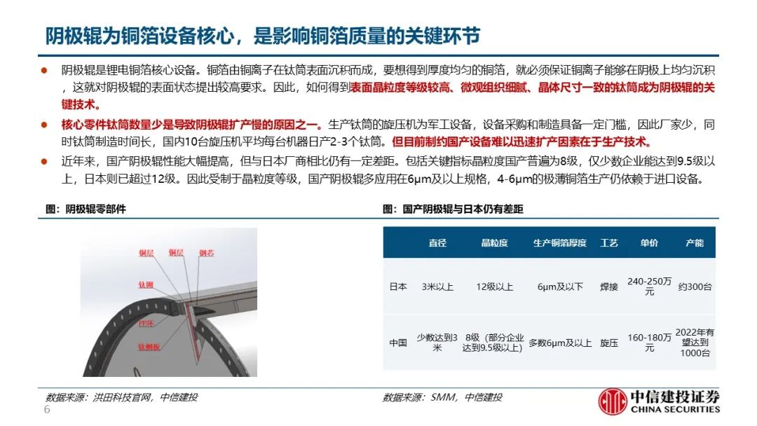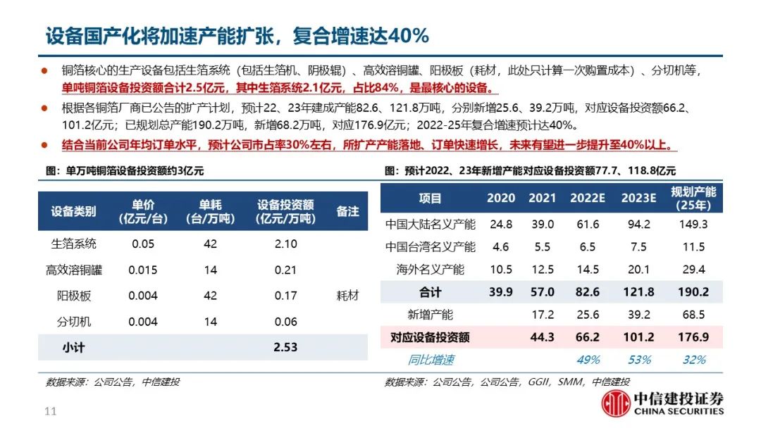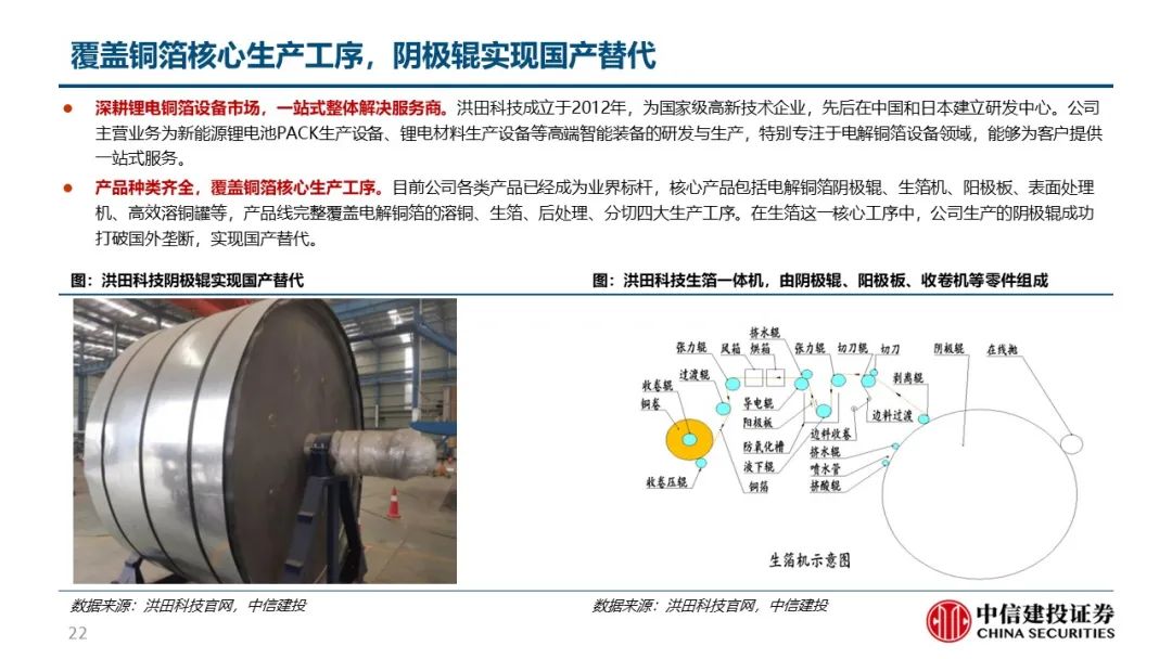 洪田为首的国内厂商突破技术瓶颈,国产替代进程加速。生箔工序用到的阴极辊是铜箔生产的最核心设备,曾受制于表面精细度等技术问题被日韩厂商技术封锁,但日韩厂商扩产慢催生国产化需求。以洪田为首的国内厂商突破技术瓶颈,国产设备渗透率快速提升。目前单吨铜箔设备投资额合计2.5亿元,根据各铜箔厂商已公告的扩产计划,预计22、23年建成产能82.6、121.8万吨,分别新增25.6、39.2万吨,对应设备投资额66.2、101.2亿元;已规划总产能190.2万吨,新增68.2万吨,对应176.9亿元;2022-25年复合增速预计达40%,空间广阔。