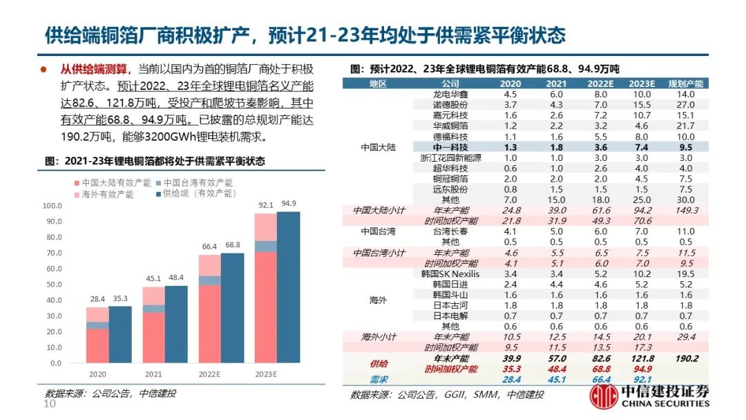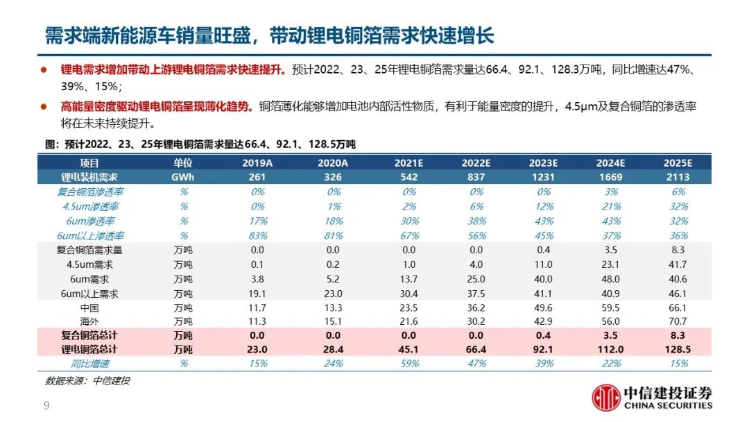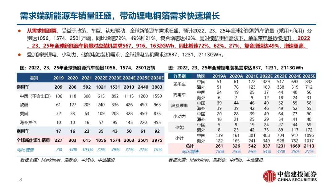 锂电需求增加带动上游锂电铜箔需求快速提升。受益于政策、车型、认知驱动,全球新能源车需求旺盛,预计2022、23、25年全球新能源车装机需求567、916、1632GWh,复合增速49%,叠加消费锂电、小动力、储能电池后全球锂电装机需求837、1231、2113GWh,复合增速41%,对应锂电铜箔需求量达66.4、92.1、128.3万吨,复合增速30%。当前以国内为首的铜箔厂商处于积极扩产状态。预计2022、23年全球锂电铜箔名义产能达82.6、121.8万吨,受投产和爬坡节奏影响,其中有效产能68.8、94.9万吨,今明年锂电铜箔都将处于供需紧平衡状态。