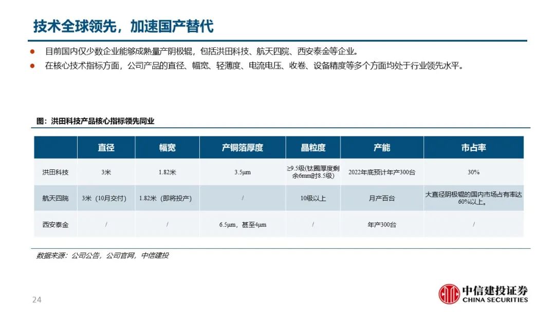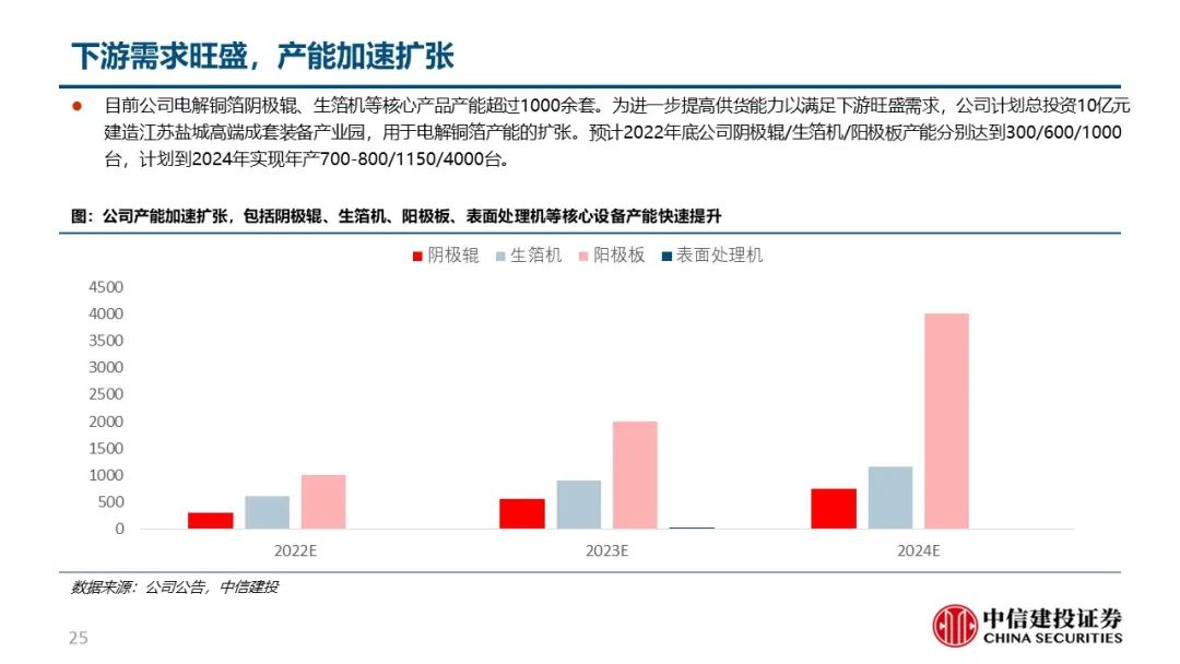 产能加速扩张,龙头地位稳固:21年底公司阴极辊、生箔机等核心产品产能超1000余套,21-24年间扩产复合增速80%以上。以公司订单和行业需求水平测算,预计公司市占率30%左右,未来有望进一步提升至40%以上。