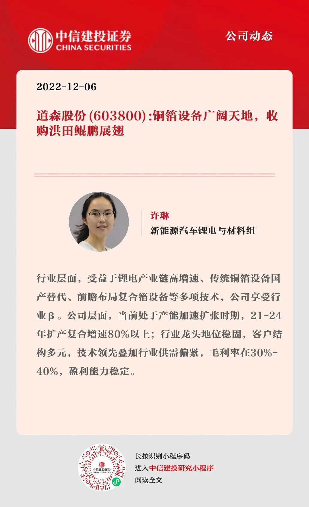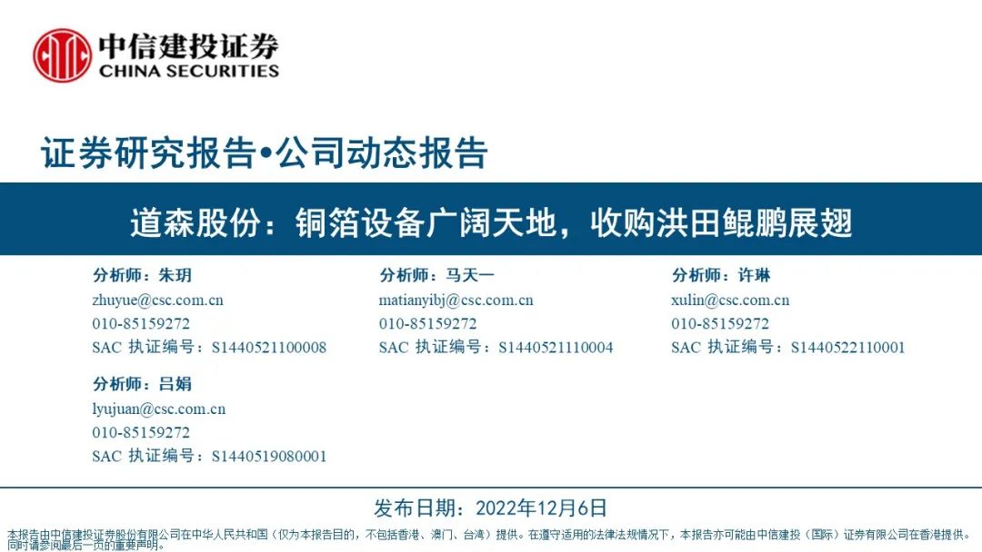 证券研究报告名称:《道森股份(603800):铜箔设备广阔天地,收购洪田鲲鹏展翅》