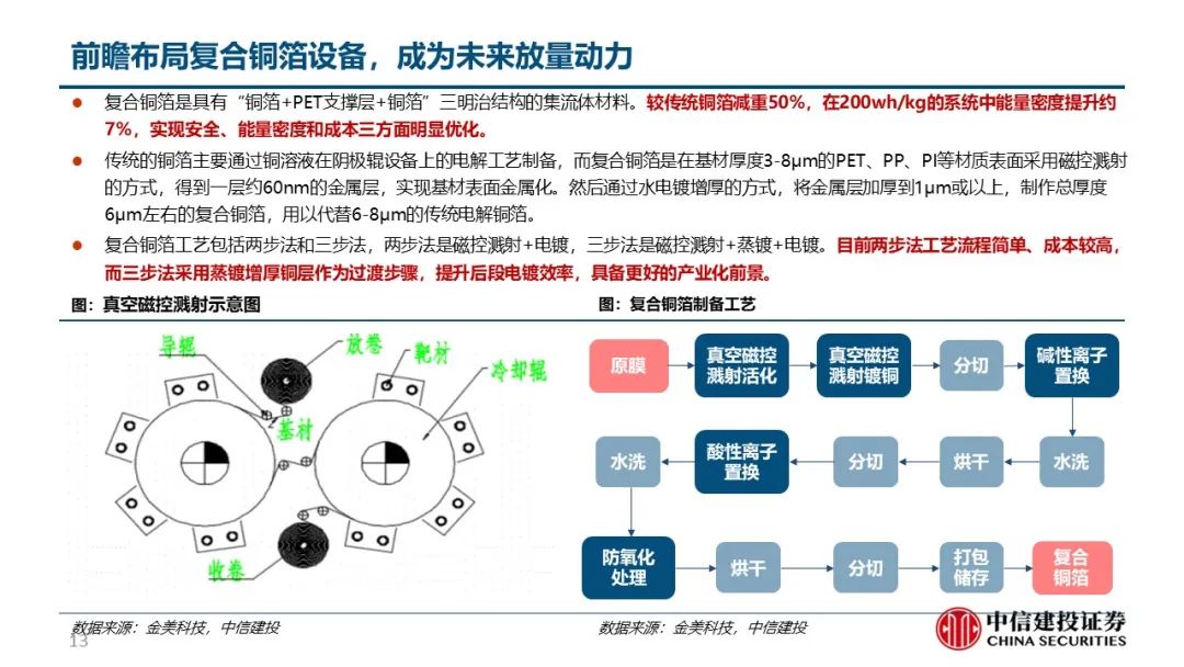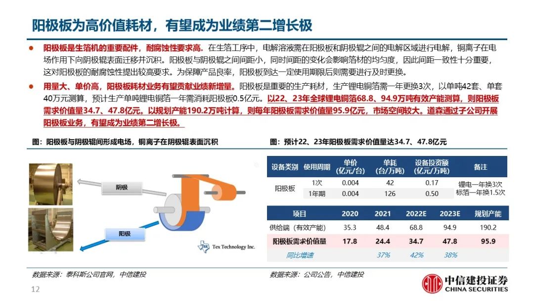 阳极板耗材+复合箔设备布局创造第二增长极。生产锂电铜箔过程中关键耗材阳极板需一年更换3次,以单吨42套、单套40万元测算,预计生产单吨锂电铜箔一年需消耗阳极板0.5亿元,对应22、23、25年全球锂电铜箔阳极板需求价值量34.7、47.8、95.9亿元。同时公司前瞻复合铜箔设备,自主研发一步法和两步法,有望在明年推出样机、送样客户。