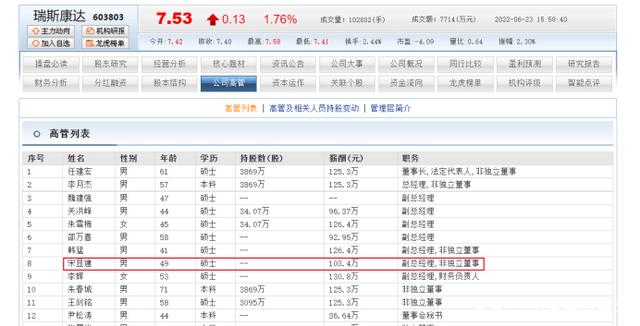 宋显建加入瑞斯康达也有十来年了,他现在的薪酬为103.4万。在这7位副总经理中处于中等水平。副总经理兼负责财务的李辉去年从公司获得的报酬稍多些,为130.8万。