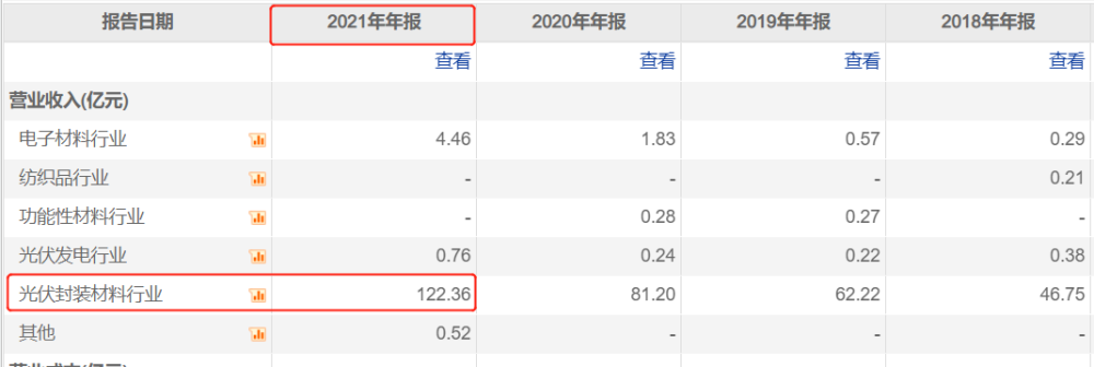 其中光伏封装材料常年贡献公司主要营收,2021年光伏封装材料带来超122亿元的营收。其中,2021年,福特斯共计销售光伏胶膜9.68亿平米,光伏胶膜带来115亿元的营业收入;销售光伏背板6822.14万平米,带来7.26亿元营收。