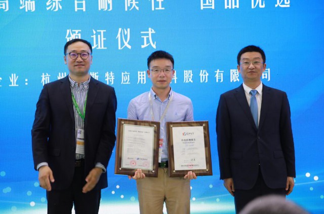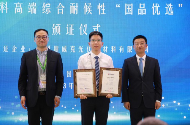 5月24日在CPVT展台,华能清能院院长助理、华能集团可再生能源领域首席专家郭辰与CPVT主任鲍军共同向福斯特、斯威克颁发了首批2张光伏组件封装用胶膜“国品优选”——高端综合耐候性检测证书和检测报告。福斯特总经理周光大、斯威克市场部总监季志超出席颁证仪式。中集来福士战略总监、中集集光总经理潘细录、中集集风总经理李鹏、华润电力技术研究院海上光伏项目负责人刘同飞见证颁证仪式。