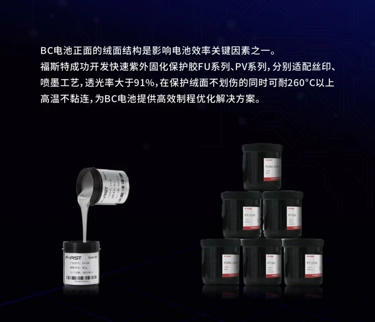 BC电池正面的绒面结构是影响电池效率关键因素之一。福斯特成功开发快速紫外固化保护胶FU系列、PV系列,分别适配丝印、喷墨工艺,透光率大于91%,在保护绒面不划伤的同时可耐260°C以上高温不黏连,为BC电池提供高效制程优化解决方案。