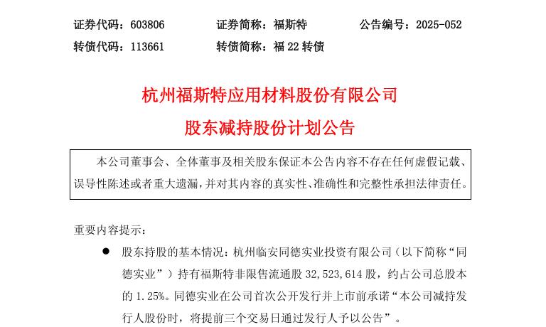 8月5日晚间,光伏胶膜龙头福斯特(603806.SH)发布公告称,股东同德实业计划减持不超过3252万股,占福斯特总股本的1.25%。减持窗口定于8月11日至11月10日。按当日14.5元/股收盘价计算,同德实业套现约4.7亿元。