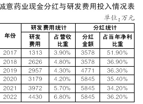 记者了解到,上市前三年,诚意药业每年分红在3500万元至4700万元之间;上市后三年,公司每年分红接近6000万元。此外,公司还进行了4次资本公积转增股本,每次均为10送4,公司股本也从8520万元增加到32730.432万元,体现了业绩增厚之后回报投资者的力度也在同步增长。同时,公司最近三年研发投入金额累计达1.16亿元,研发投入占营业收入比例为5.5%,“创新驱动”成为增厚业绩的主动力。
