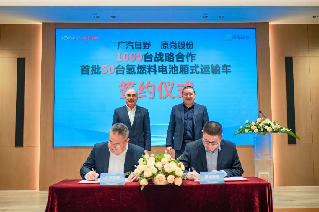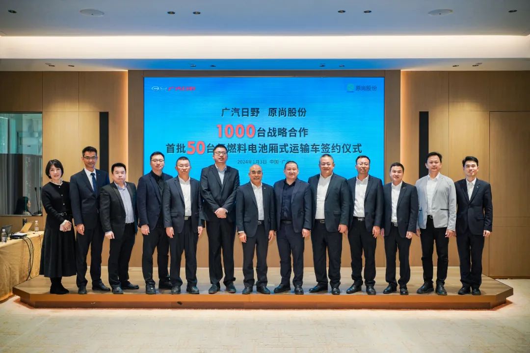 2024年1月3日,原尚股份与广汽日野首批50台氢燃料电池厢式运输车订单签约仪式在广州从化圆满举行。原尚股份董事长余军,总经理曾海屏,以及原锋新能源总经理陈海华,广汽集团执委、广汽日野董事长陈秀深,广汽日野执行副总经理张志勇,广汽日野党委书记、工会主席夏强等代表出席签约仪式。
