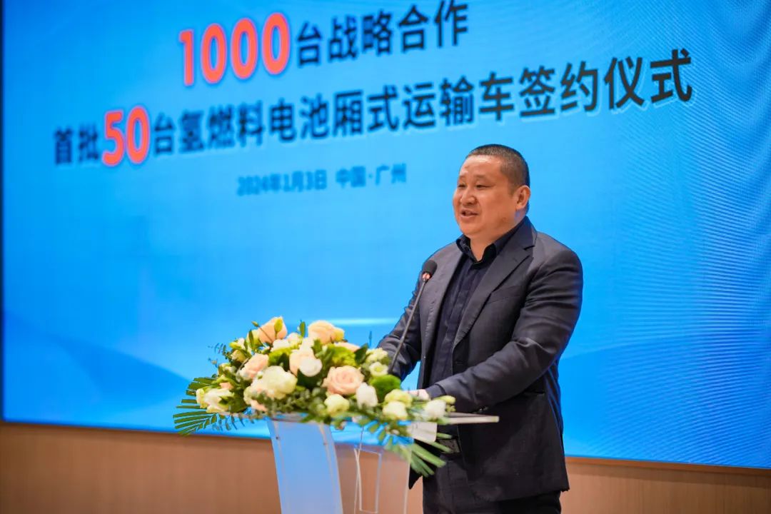 签约仪式上,原尚股份董事长余军表示,2024年开年之际,原尚股份与广汽集团、广汽日野签约首批50台氢燃料电池厢式运输车订单,标志着原尚股份与广汽集团、广汽日野的全面战略合作开启了全新的篇章。氢燃料电堆产业化将有助于原尚股份加快传统燃油车更替,减轻燃油车辆尾气排放产生的环境污染问题,实现公司经济效益、社会效益、环境效益的协调发展,是综合合同物流企业实现碳达峰,加快绿色低碳发展,全面提高资源利用效率的重要举措,原尚股份将与广汽日野共同打造国内氢能商用车领域的创新供应链和产业链,为广东省广州市引领全国氢能商用车技术创新和产业发展作出重要贡献。