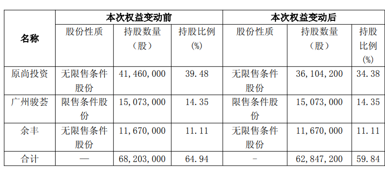 截至本报告书签署日,原尚投资持有公司 4,146 万股股份,占公司总股本的39.48%,为公司控股股东;广州骏荟持有公司 1,507.3 万股,占公司总股本的14.35%;余丰持有公司 1,167 万股股份,占公司总股本的11.11%。原尚投资和广州骏荟均为余军控制,余丰与余军为兄弟关系,故广州骏荟、余丰为原尚投资的一致行动人。