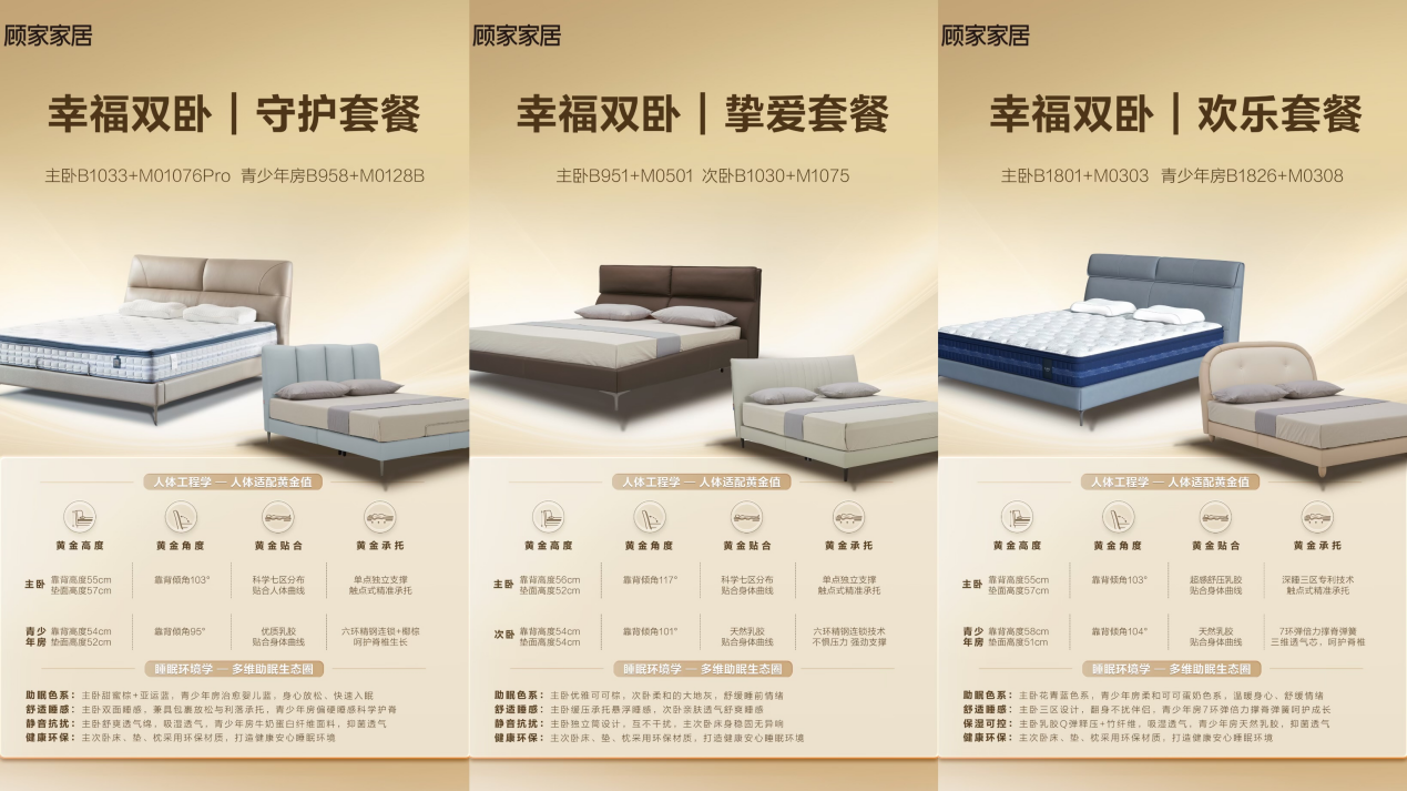 双十一之际,顾家家居推出三大幸福双卧套餐,挚爱套餐、守护套餐、欢乐套餐,为中国家庭全员的健康睡眠护航。