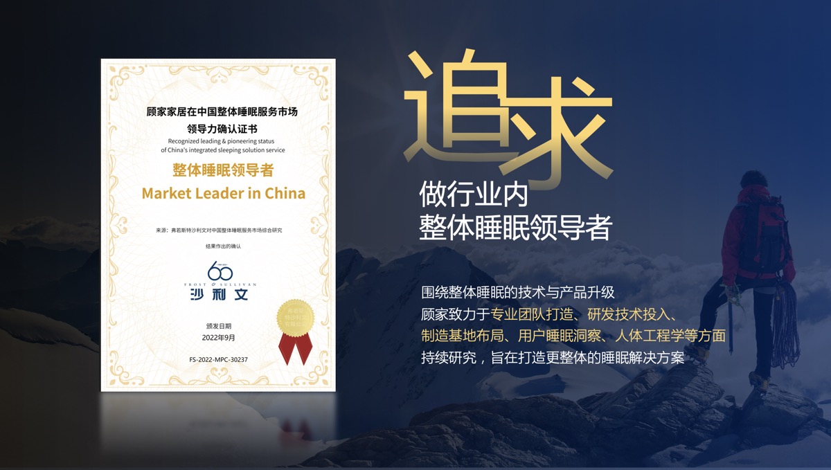 围绕整体睡眠的技术和产品升级,顾家家居在专业团队打造、研发技术投入、制造基地布局、用户睡眠洞察、人体工程学等方面持续研究,从数字化、智能化、品牌化三方面持续引领引领中国整体睡眠服务市场发展。通过对整体睡眠的持续研发投入,顾家整体睡眠得到了全球知名的投资与企业增长咨询机构沙利文做出的“整体睡眠领导者”的领导力确认。在消费终端,通过“好床好垫配好枕,顾家深睡有一套”的广告语抢占消费者心智,经过一年的市场验证,其产品得到了超过30000户消费者的认可。