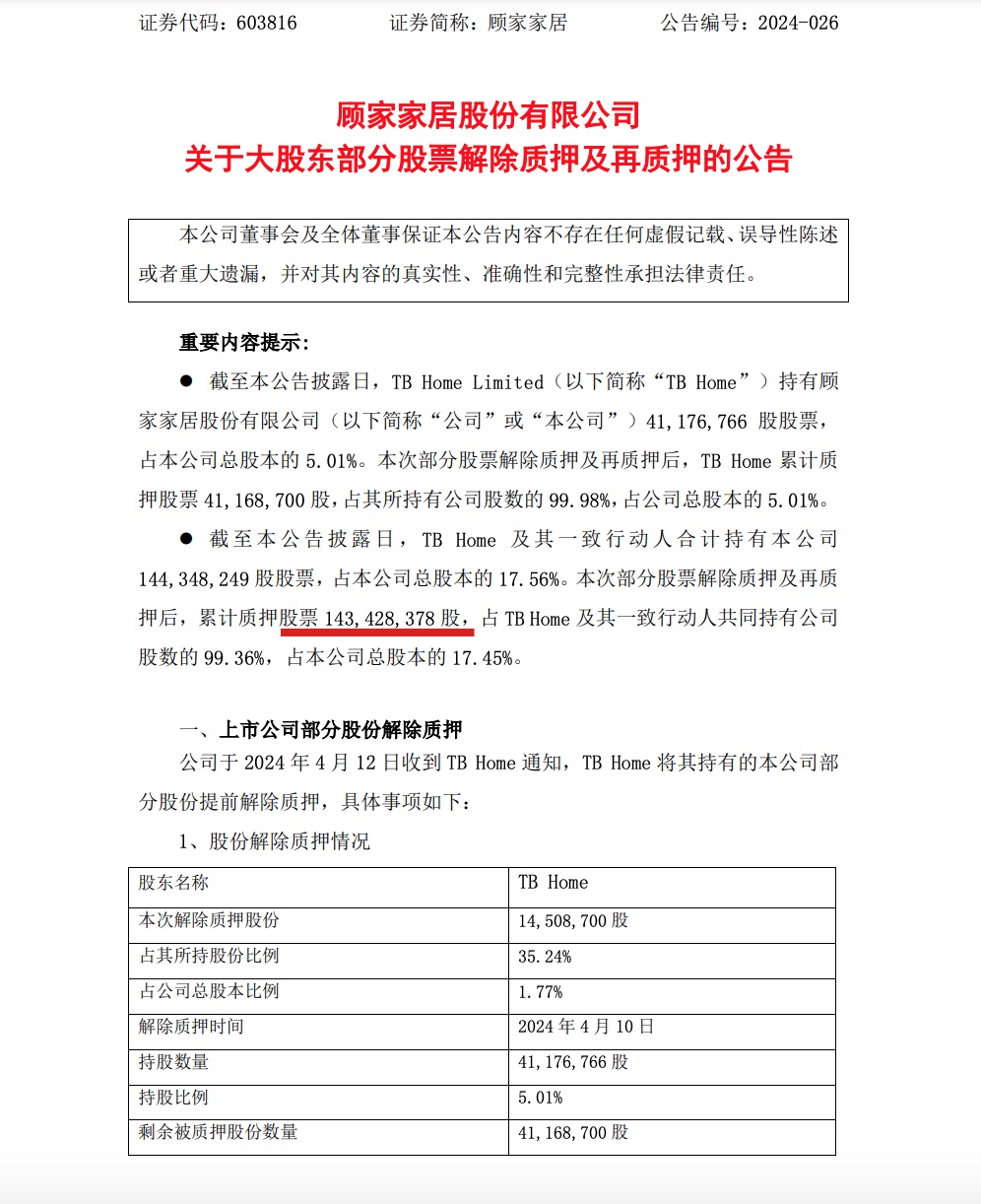 公告披露,顾家家居表示,TB Home目前持有顾家家居41,176,766股,占公司总股本的5.01%。此前,TB Home累计质押了其所持有的股份中的99.98%,即41,168,700股,同样占顾家家居总股本的5.01%。TB Home及其一致行动人共持有顾家家居144,348,249股,占总股本的17.56%,累计质押股份为143,428,378股,占总股本的17.45%。