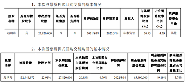 控制人赵瑞海先生的通知,因质权人华泰证券(上海)资产管理有限公司更换资产管理计划产品的原因,赵瑞海先生将其持有的公司部分股权质押解除及再质押: