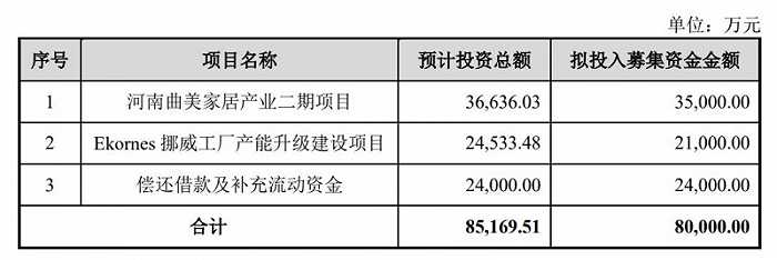 根据8月15日收盘后披露的募集说明书(申报稿),曲美家居拟发行不超过1.17亿股股票,募集的资金总额预计不超过8亿元(含本数),扣除发行及相关费用后,河南曲美家居产业二期项目预计需要3.50亿元,Ekornes挪威工厂产能升级建设项目预计需要2.10亿元,而偿还借款及补充流动资金需要2.40亿元。