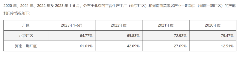 曲美家居对审核中心意见落实函的回复显示,2020年、2021年、2022年及2023年1-6月,河南曲美家居产业一期项目(河南一期厂区)的产能利用率分别为12.51%、27.09%、42.09%、61.01%。“河南曲美家居产业一期项目”于2019年完成建设并投入使用,近几年的产能利用率有所上升,但尚未达产。