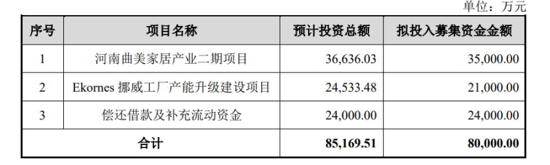 其中,河南曲美家居产业二期项目拟投入募集资金金额3.5亿元,Ekornes 挪威工厂产能升级建设项目拟投入募集资金金额2.1亿元,此外,2.4亿元用于偿还借款及补充流动资金。