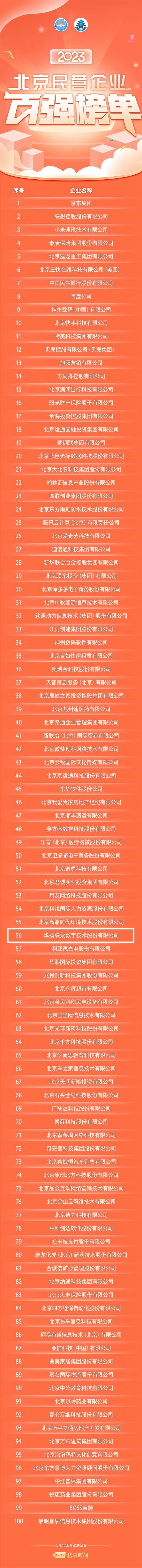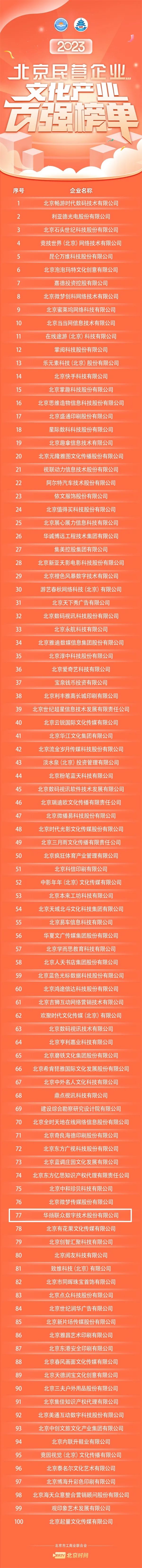 9月22日,2023北京民营企业百强榜单公布,华扬联众再次入围——在北京民营企业百强榜单中位列第56,在北京民营企业文化产业百强榜单中位列第77。