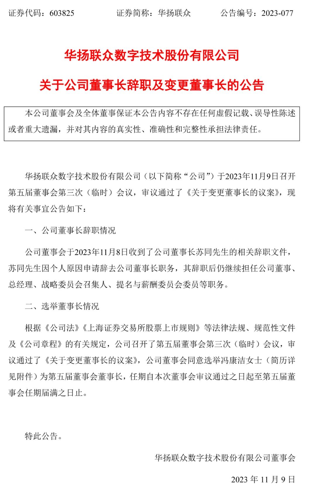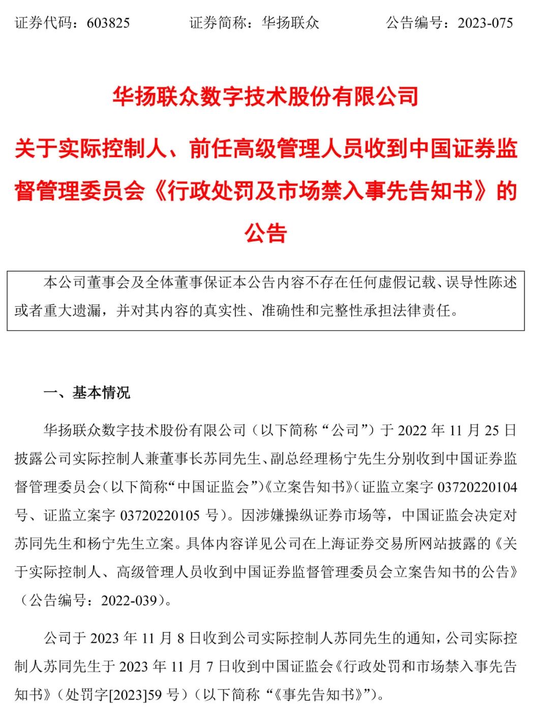 根据上述中国证监会的决定,华扬联众实控人兼董事长苏同在11月8日,因个人原因申请辞去公司董事长职务,并继续担任继续担任公司董事、总经理、战略委员会召集人、提名与薪酬委员会委员等职务。而另一位被告人杨宁已在今年11月前卸任副总经理职务。