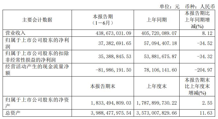 2023年上半年,坤彩科技实现营业收入4.39亿元,同比增长8.12%;归属于上市公司股东的净利润3738.27万元,同比减少34.52%;归属于上市公司股东的扣除非经常性损益的净利润3538.88万元,同比减少34.32%;经营活动产生的现金流量净额-8198.62万元,上年同期7810.61万元。