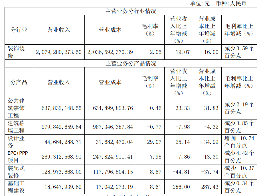 分产品来看,公共建筑装饰工程营收6.38亿元,同比降33.33%;建筑幕墙工程营收9.8亿元,同比降7.98%;设计业务营收4466.43万元,同比降25.14%;EPC+PPP项目营收2.69亿元,同比增7.86%;装配式装修营收1.29亿元,同比降44.81%;基础工程建设营收1864.79万元,同比增286%。