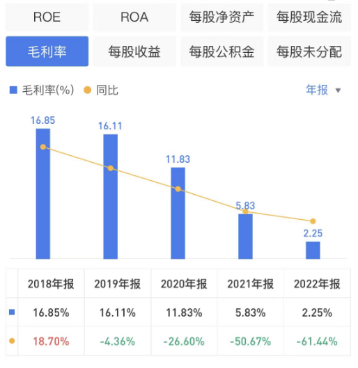 从毛利率来看,2019年-2022年,柯利达毛利率分别为16.11%、11.83%、5.83%、2.25%。