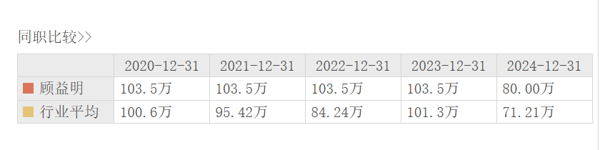 顾益明2024年薪酬为80万元,较2023年同期的103.5万元,同比降23%。