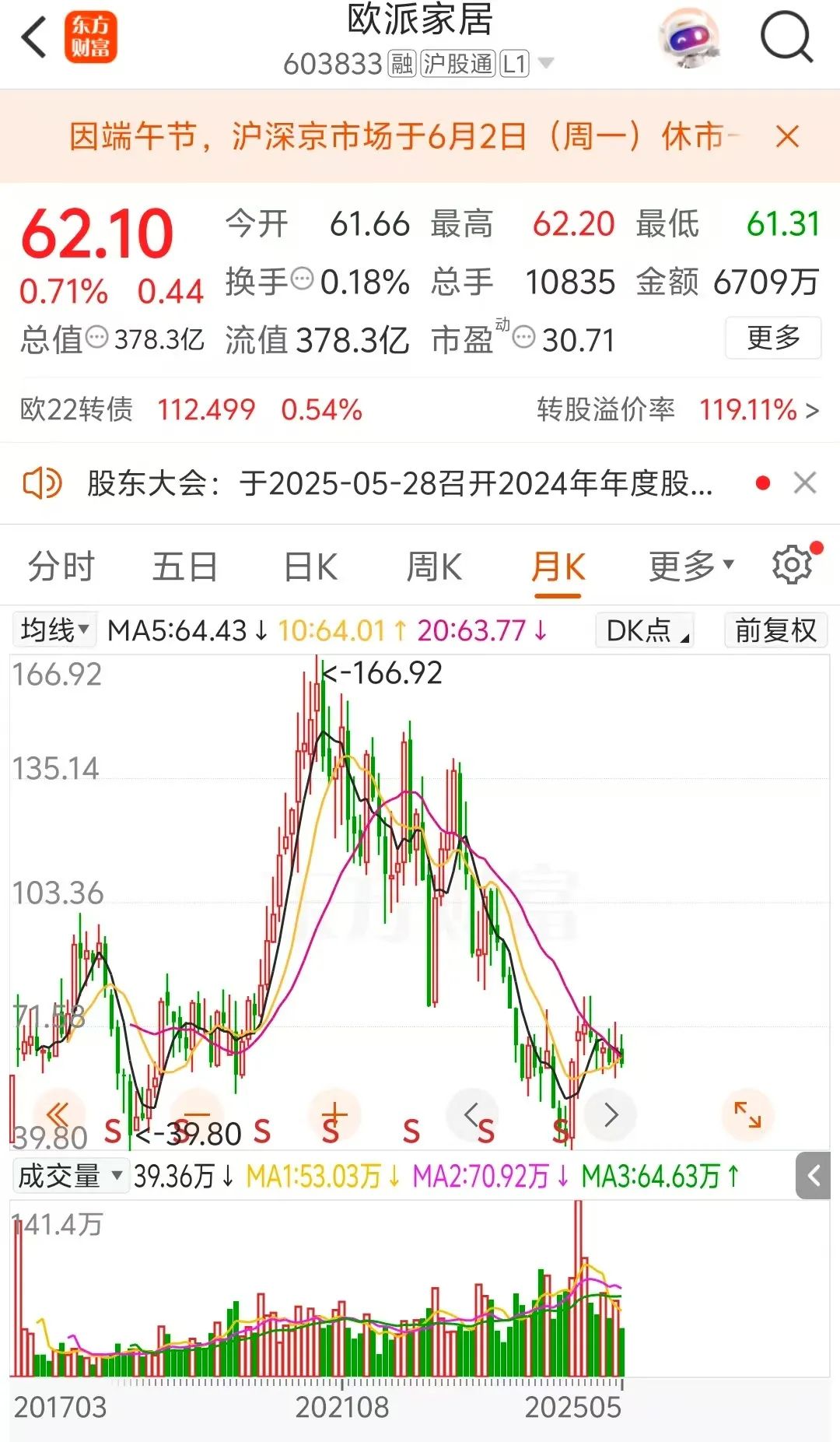 资料显示,欧派家居创立于1994年,是中国定制家居行业龙头,亦是首个市值破千亿元的上市企业,已形成覆盖多层次消费群体的品牌发展矩阵。截至5月29日收盘,欧派家居市值为378.3亿元。