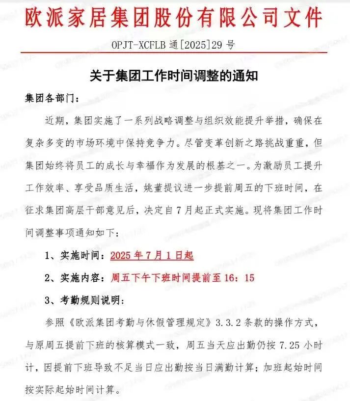 近日,一份标注为“欧派家居集团股份有限公司”的内部文件在社交平台流传。文件显示,该公司拟自2025年7月1日起,将每周五的下班时间提前至16:15,并明确考勤按满勤计算。