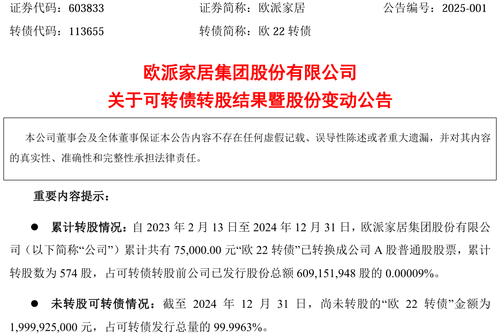 这已不是该转债存续期内的首次价格调整。自2022年8月发行以来,“欧22转债”初始转股价为125.46元/股,后因权益分派等因素逐步下调至120.95元/股。然而,这些调整并未有效促进转股进程。截至2024年12月31日,欧派家居累计转股金额仅7.5万元,对应转股数为574股,未转股余额高达19.99925亿元,占发行总量99.9963%。
