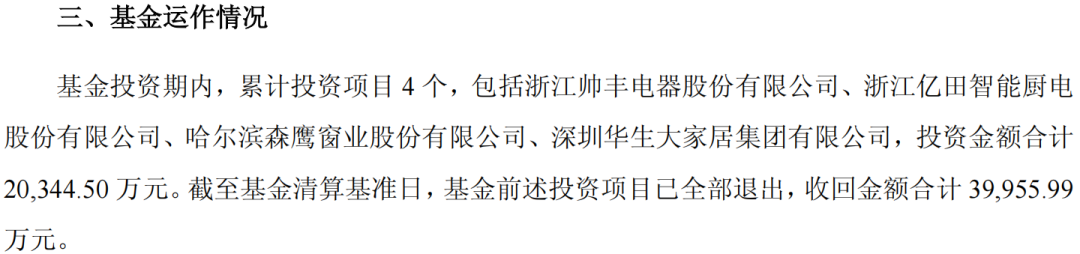2025年7月23日,欧派家居集团股份有限公司(603833.SH,简称“欧派家居”)公告其子公司参与投资的产业基金即将实施清算。该基金投资期内,累计投资4个项目并已全部退出,对其投资金额为2.03亿元,而收回金额为4.00亿元,持有期收益率或高达96%,具体可赎回金额以实际清算结果为准。