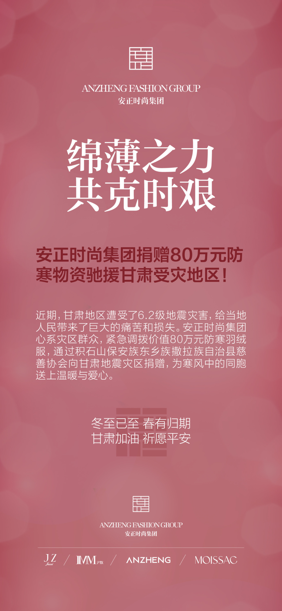 安正时尚集团多年来始终关注慈善事业,积极参与灾情支援、爱心助学、助困等行动。在此次甘肃地震灾害中,安正时尚集团再次用实际行动诠释了企业担当。