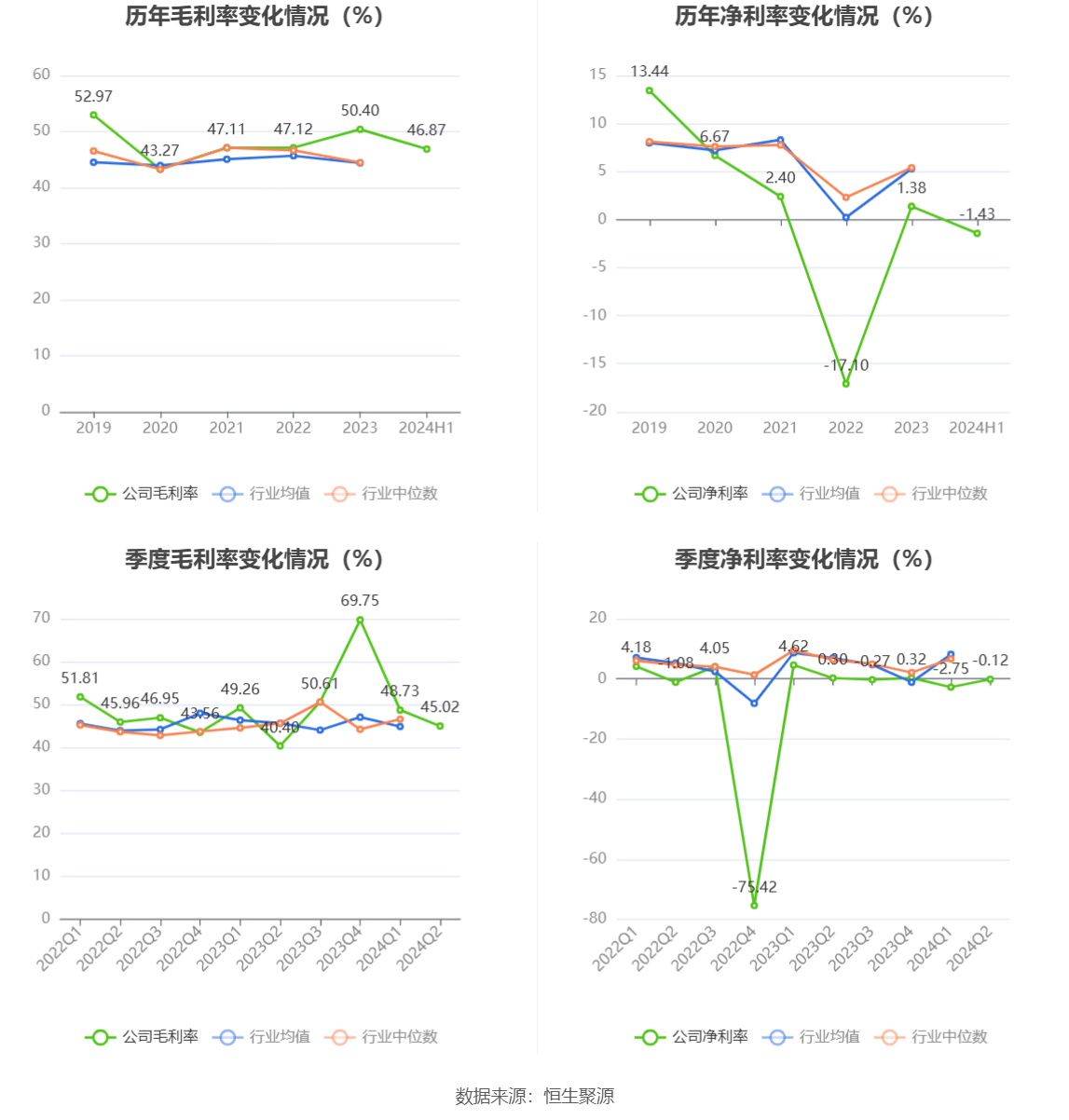 2024年上半年,公司毛利率为46.87%,同比上升2.33个百分点;净利率为-1.43%,较上年同期下降3.75个百分点。从单季度指标来看,2024年第二季度公司毛利率为45.02%,同比上升4.62个百分点,环比下降3.71个百分点;净利率为-0.12%,较上年同期下降0.42个百分点,较上一季度上升2.63个百分点。