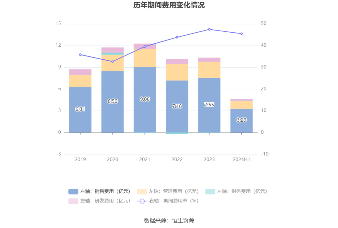 2024年上半年,公司期间费用为4.64亿元,较上年同期减少5771.65万元;但期间费用率为45.47%,较上年同期上升5.09个百分点。其中,销售费用同比下降11.87%,管理费用同比下降10.08%,研发费用同比下降21.7%,财务费用由去年同期的-117.91万元变为390.35万元。