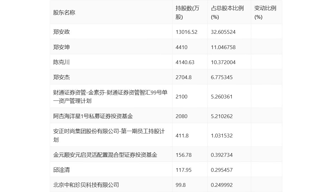 半年报显示,2024年上半年末公司十大流通股东中,新进股东为阿杏海洋星1号私募证券投资基金、金元顺安元启灵活配置混合型证券投资基金、邱淦清、北京中和珍贝科技有限公司,取代了一季度末的郑秀萍、丁勇、苏学勇、赵颖。在具体持股比例上,陈克川、安正时尚集团股份有限公司-第一期员工持股计划持股有所下降。