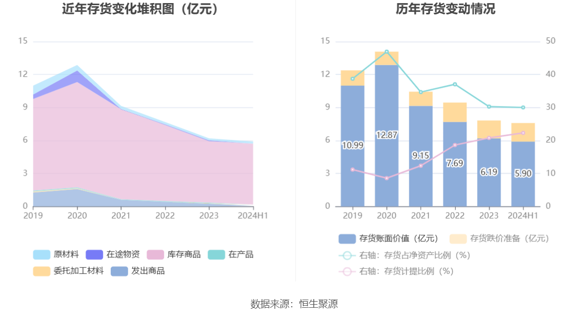 从存货变动来看,截至2024年上半年末,公司存货账面价值为5.9亿元,占净资产的30.02%,较上年末减少2866.09万元。其中,存货跌价准备为1.69亿元,计提比例为22.3%。